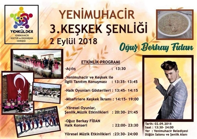 Yenimuhacir Kültür ve Dayanışma Derneği (YENKÜLDER)’nin geleneksel hale gelen ve bu yıl 3.'sü gerçekleştirilecek olan Keşkek Şenliği'nin programı belli oldu.