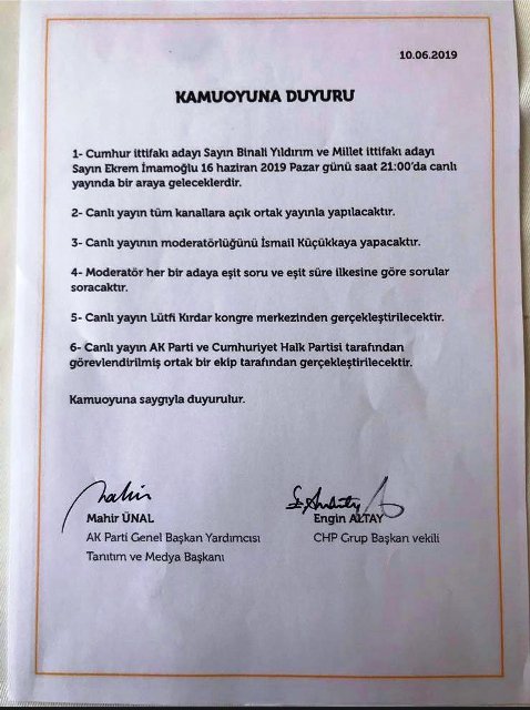 AKP Tanıtım ve Medya Başkanı Mahir Ünal ile CHP Grup Başkanvekili Engin Altay, İstanbul Büyükşehir Belediye Başkanlığı seçimi öncesi Ekrem İmamoğlu ve Binali Yıldırım arasında yapılması planlanan ortak yayın için birlikte açıklama yaptı.