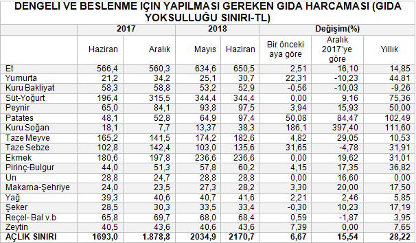 Dört kişilik bir ailenin gıda yoksulluğu sınırının haziran ayında yüzde 6,67 oranında artışla 2 bin 170,7 liraya yükselmesinde et, yumurta, peynir, patates, soğan, taze sebze, yağ, zeytin gibi besin gruplarında yaşanan yüksek oranlı fiyat artışları belirleyici oldu.