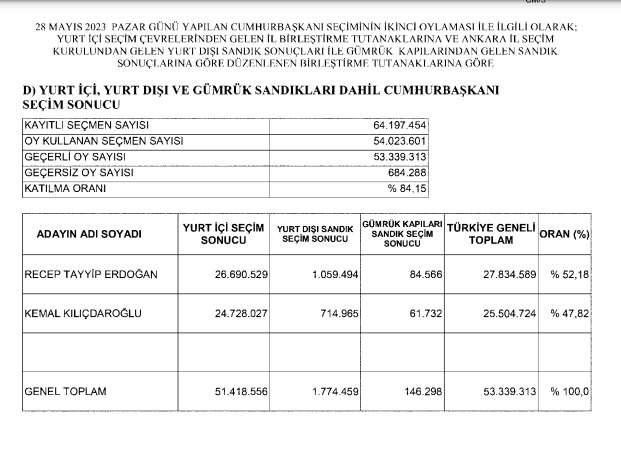 Bu sonuçlara göre sayın Recep Tayyip Erdoğan'ın toplam 27 milyon 834 bin 589 oy aldığı ve yüzde 52,18 oy oranına ulaştığı, sayın Kemal Kılıçdaroğlu'nun 25 milyon 504 bin 724 oy aldığı ve toplam yüzde 47,82 oy oranına ulaştığı görülmüş olup, kurulumuzun yapmış olduğu değerlendirmeler ve almış olduğu kararlar sonucunda sayın Cumhurbaşkanı Recep Tayyip Erdoğan'ın cumhurbaşkanı olarak seçildiği anlaşılmış ve Resmi Gazete'ye gönderilmiştir.