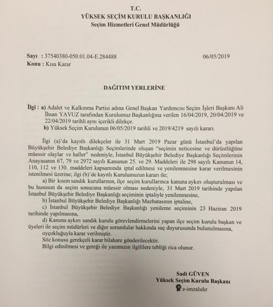 YSK İstanbul Büyükşehir seçimi iptal kararı;